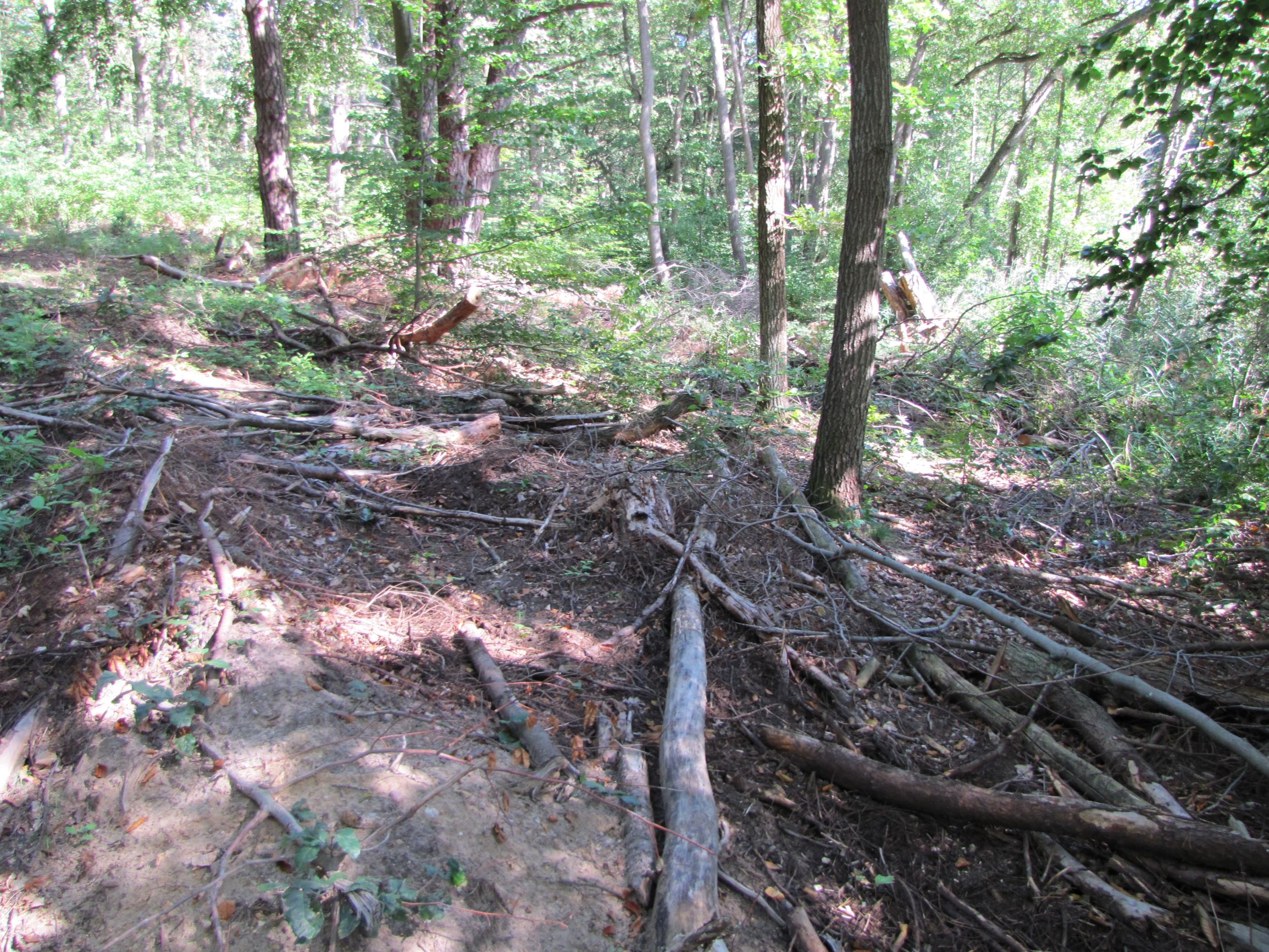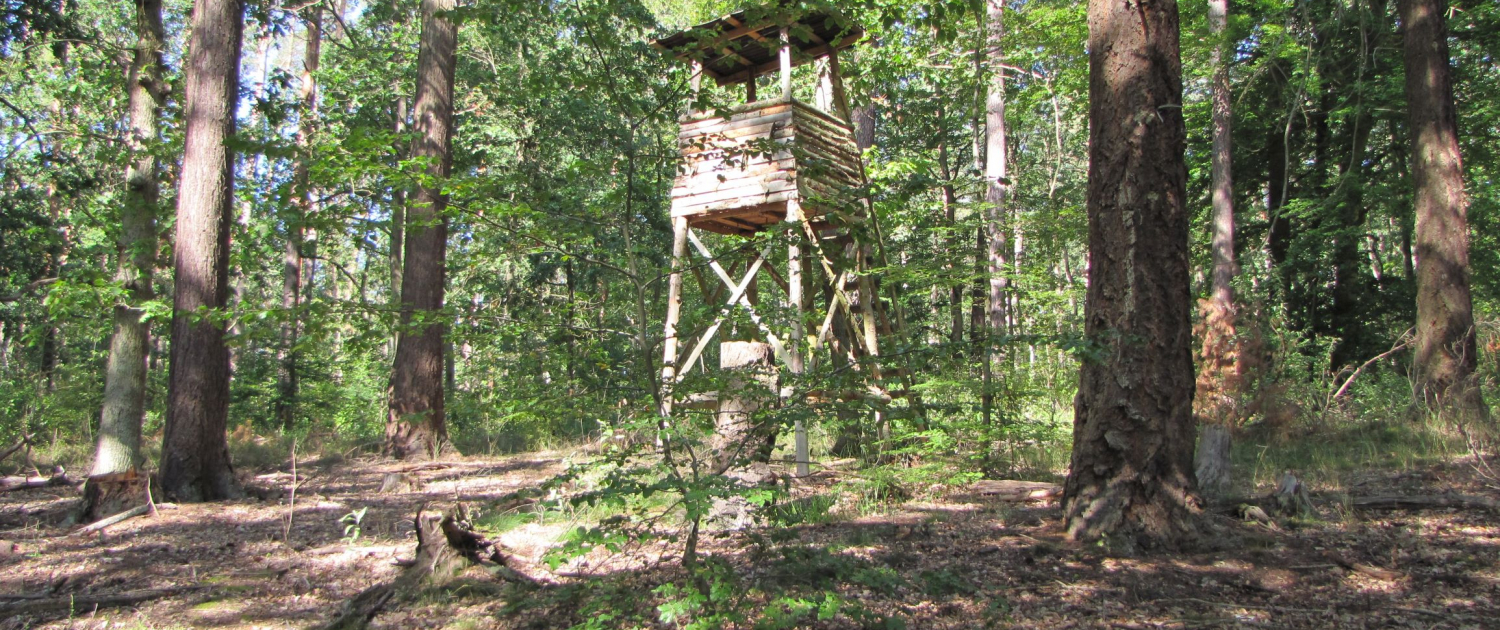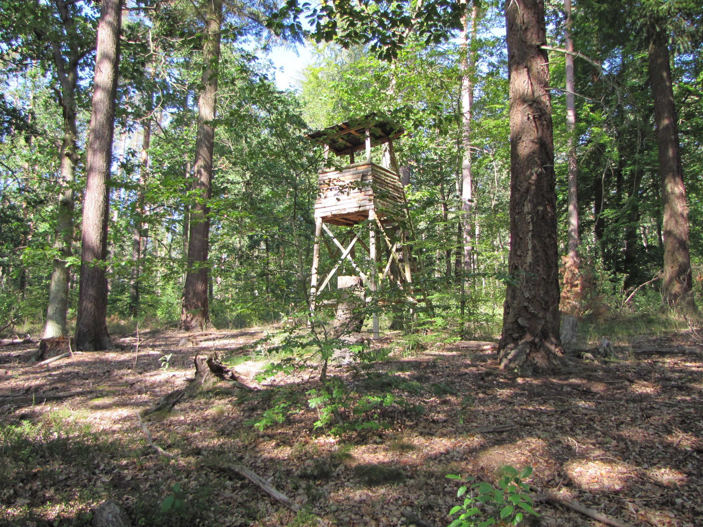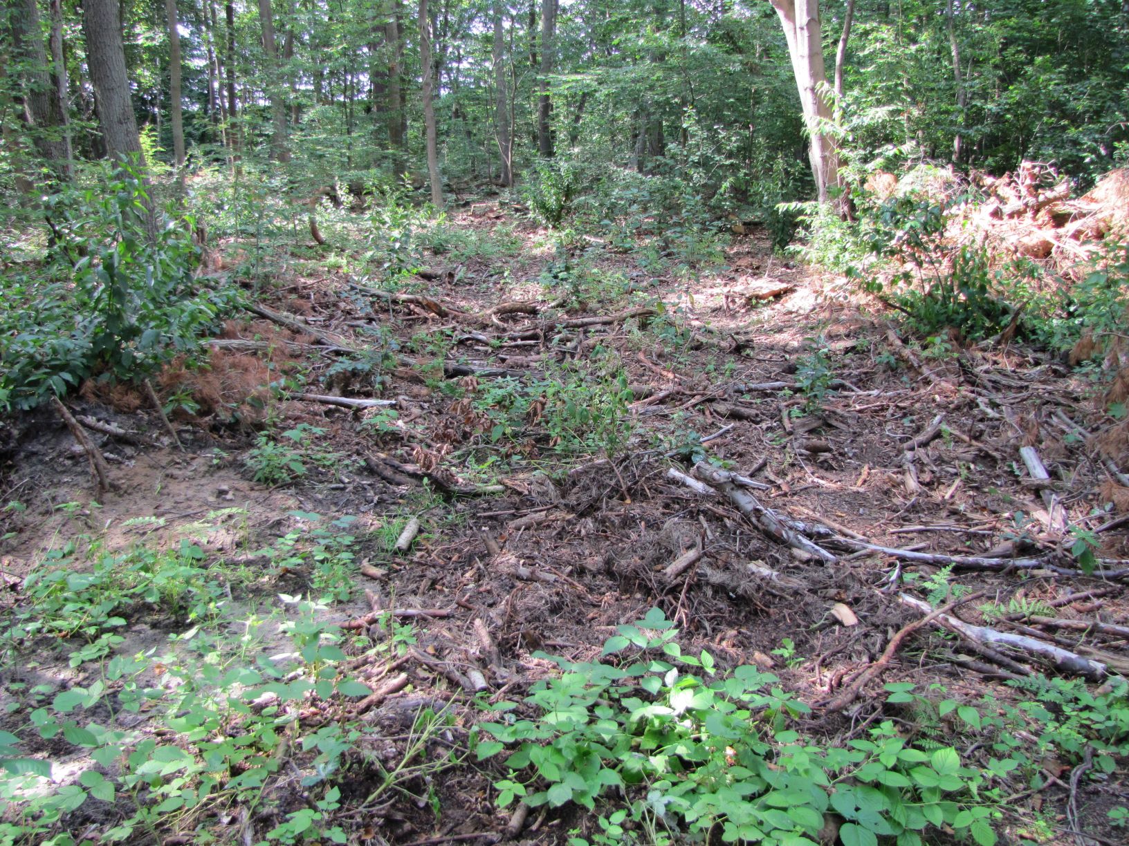 Die Gegend um die rote Markierung am See (zu sehen im u.g. Bild) ist Einstandsgebiet für Rotwild. Das Kreuz markiert den Stand einer Jagdkanzel, die rote Markierung kennzeichnet die mit einem Harvester speziell für die Schußrichtung zum See abgeholzte Fläche. Die auf den weiteren Fotos dokumentierte Verwüstung war einmal der Wanderweg.