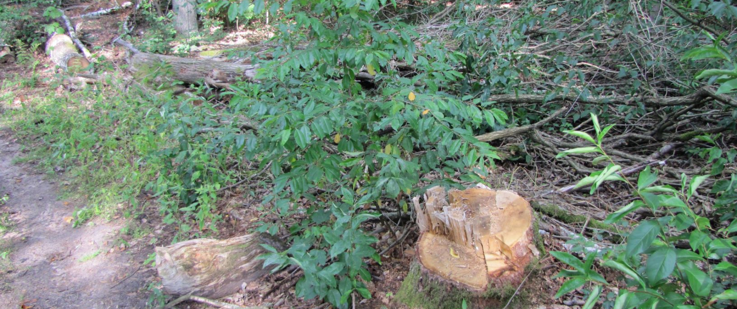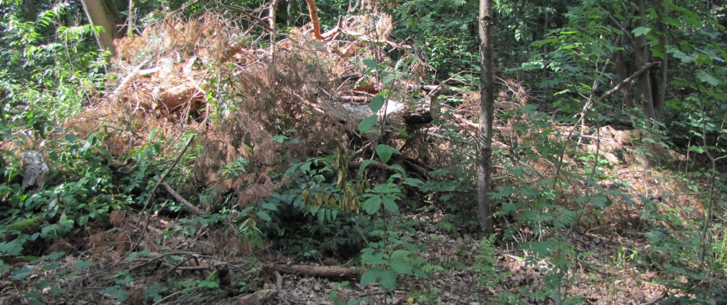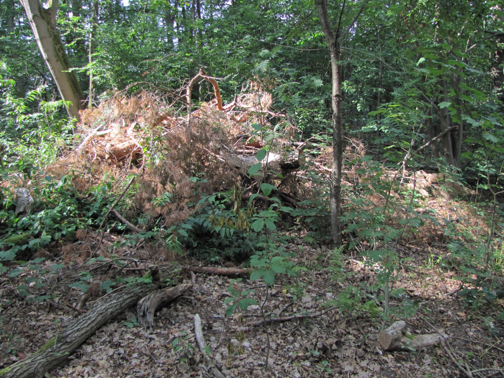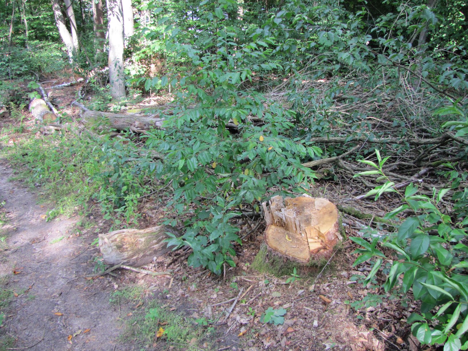 Die Gegend um die rote Markierung am See (zu sehen im u.g. Bild) ist Einstandsgebiet für Rotwild. Das Kreuz markiert den Stand einer Jagdkanzel, die rote Markierung kennzeichnet die mit einem Harvester speziell für die Schußrichtung zum See abgeholzte Fläche. Die auf den weiteren Fotos dokumentierte Verwüstung war einmal der Wanderweg.